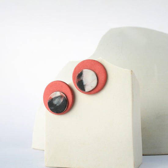 Estos elegantes pendientes geométricos combinan dos círculos superpuestos con efecto marmoleado, creando un diseño único y moderno en tonos rojo, negro y blanco. Sencillos, cómodos y llenos de personalidad.